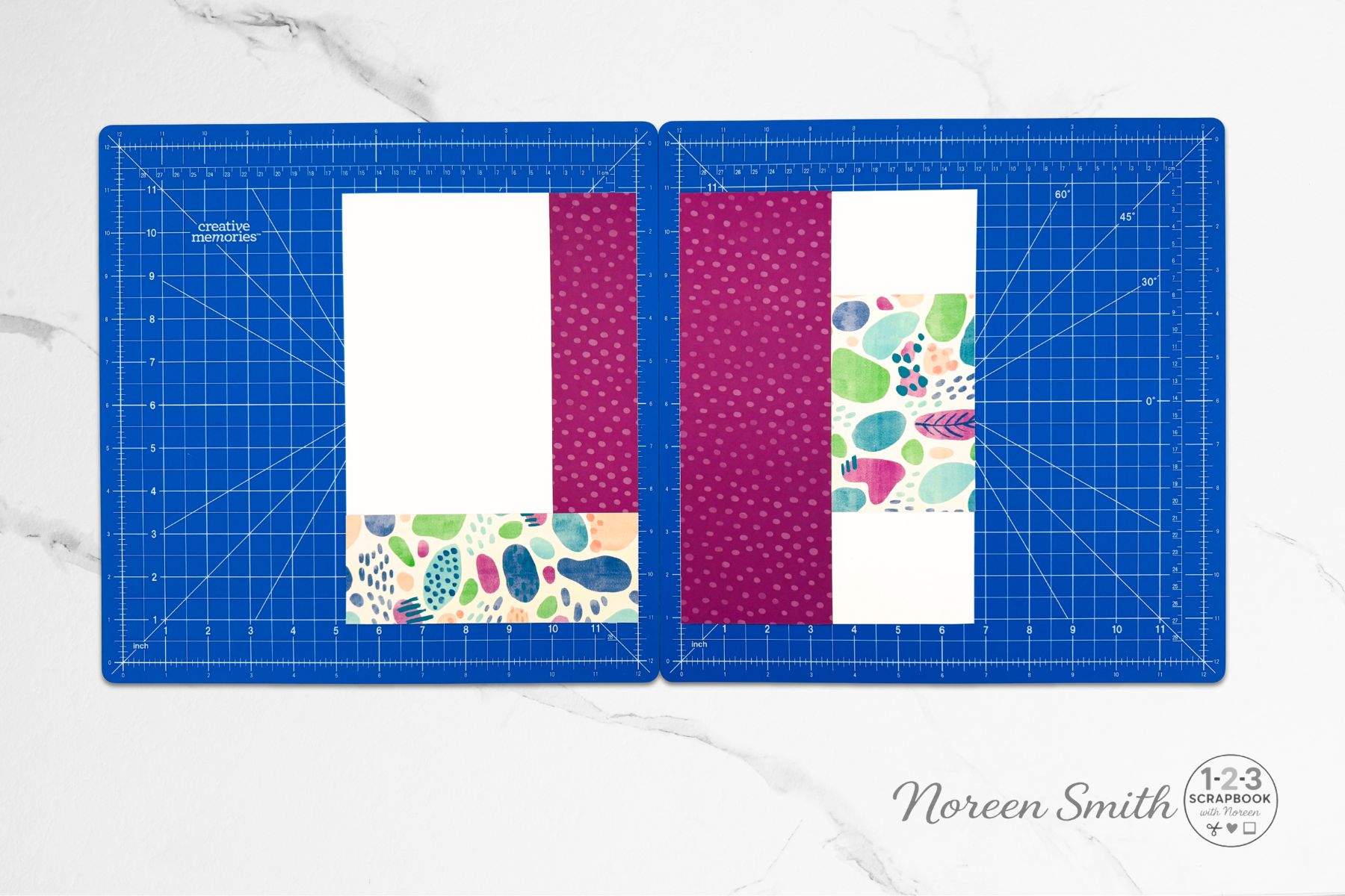 Each base page follows the same basic format - two strips down the center of the layout, one strip across the bottom of the left page and a block on the outside edge of the right page - but each piece is right-sized to fit the proportion of the layout.